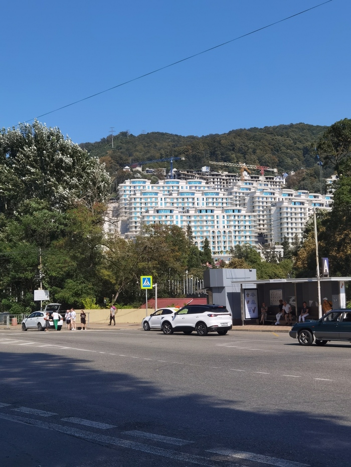 Решили не повторять ошибок двух первых дней и сэкономить время и силы, проехав на автобусе. На остановке был вид на очередной гигантский отель. Иногда кажется, что здесь строится домов (а точнее отелей) больше, чем уже стоит.