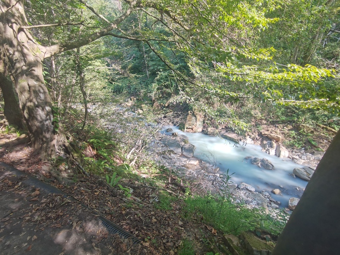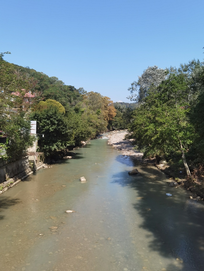 Очередная касса на Агурские водопады, заплатили за вход в парк. Прошли поляну Высоцкого, с которой открывался вид на реку Агура. Река странного беловатого цвета, как будто сильно замыленная.