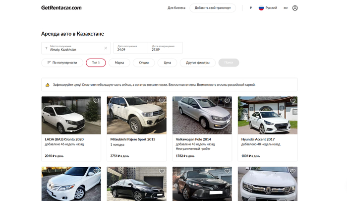 ▶️ GetRentacar— найдите выгодные авто у локальных прокатчиков, бронируйте без предоплаты и оплачивайте в удобной валюте в Алматы.