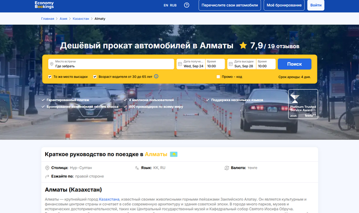 EconomyBookings — это отличный «агрегатор с калькулятором»: платформа подтягивает предложения казахстанских и международных прокатчиков, даёт мощный фильтр и помогает увидеть не рекламную цену, а честное сравнение «яблок с яблоками». Звучит просто, но на практике спасает бюджет: с одинаковой категорией и пробегом разница между провайдерами доходит до десятков процентов, а вы наглядно видите, где именно «сидят» деньги — в страховании, депозите или политике топлива.