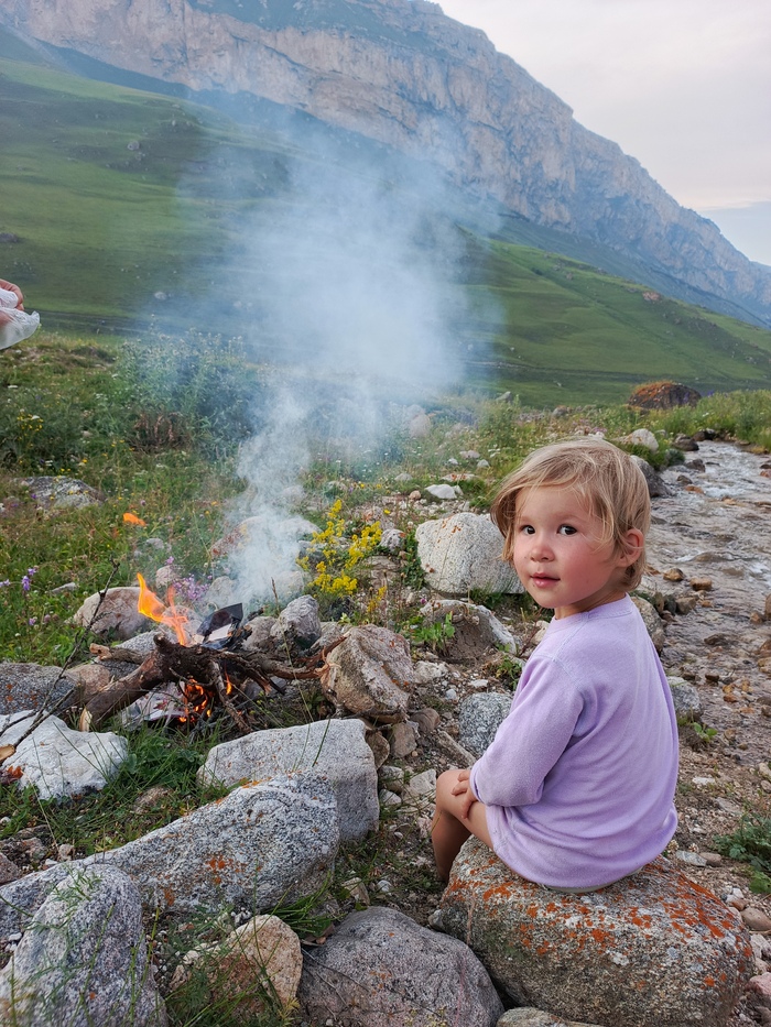 Если в Архызе мы все пять дней были вдали от цивилизации, то на этот раз быстро вышли обратно к людям. Нам попались несколько пастушьих домиков, а с другой стороны реки Хазнидон ездили машины. Да и на ночевку мы остановились в месте, которое облюбовали местные жители для отдыха. Зато у нас получился классный костер, и дочь была счастлива. Да и мы тоже: чем тяжелее дневной переход, тем лучше потом сидеть вечерком и наслаждаться видами.