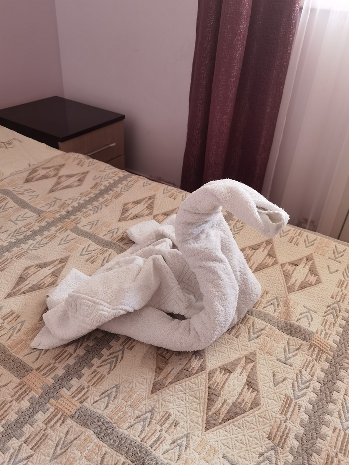 Перед отъездом из номера я попыталась сделать лебедя из оставшихся чистых полотенец. Просто так.