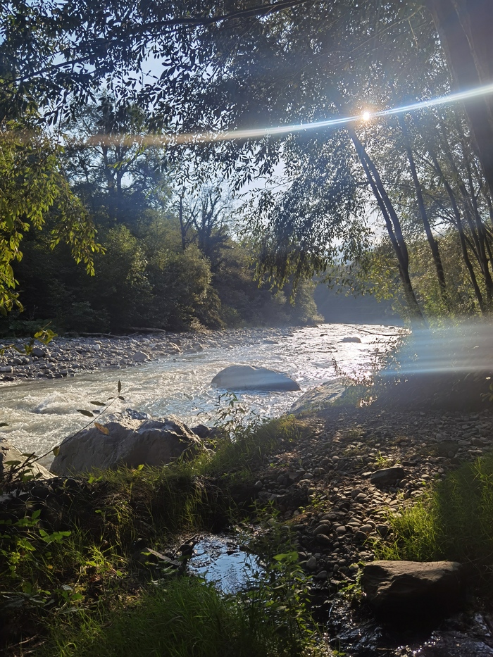 Вернулись к берегу, я стала готовить обед, а Олег пошел посмотреть родник, быть может, исток немного дальше, в кустах? Вскоре вернулся и сказал, что один из мужчин, которые бухали неподалеку, проявлял агрессию, решив, что Олег закладчик и не особо ему поверив, когда тот сказал, что искал родник. Но когда его все же удалось убедить (с третьего раза), мужик сказал: "Мы – местные, а вы тут гости! Если закладчиков увидишь – сразу бей их!" И ещё что-то в таком духе.
