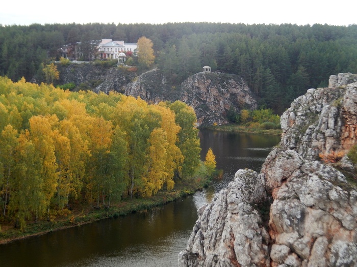 Любоваться чарующими видами скал и излучины Исети лучше всего от ротонды, которая расположена на территории санатория. Отсюда открывается панорама невероятной красоты: горная река, скалы Филин, Три пещеры и Каменные ворота (которые заслуживают звание самой необычной скалы на Исети). Вдали на горизонте видны купола церкви Покрова Божьей Матери. Внизу по реке проплывают речные трамвайчики (о которых отдельно).
