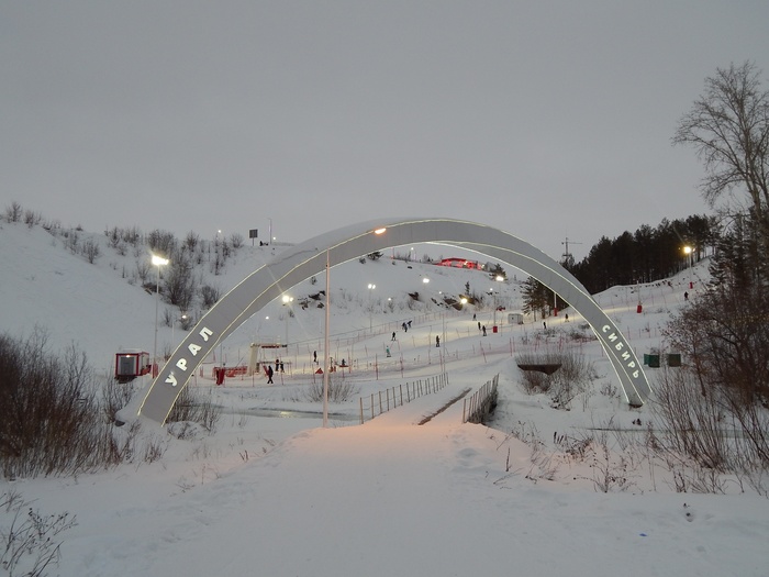 Собственно говоря, по версии тов. Гусева, Красногорский район города и часть Синарского находятся на Урале, остальная часть – в Сибири. А река Каменка служит своего рода границей между ними. Арка в целом симпатична. Выглядит интересно и лаконично. В вечернее время арка подсвечивается. Также прямо у арки находится горнолыжная трасса.