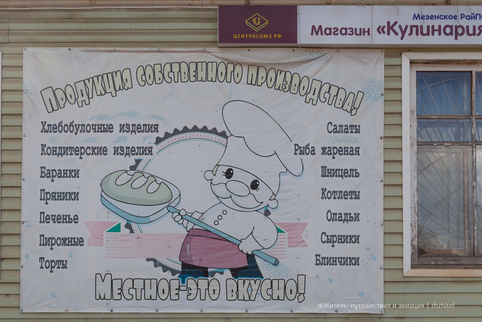 После обеда зашли в кулинарию напротив, судя по вывеске это тоже Мезенское РайПО. Я был здесь зимой четыре года назад, мне очень запомнились выпечка и колоритный ненец в малице с большим ножом на поясе, приехавший к кулинарии на снегоходе за хлебом из стойбища. В этот раз кулинария также не подкачала.