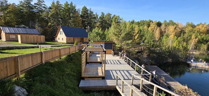 Проживание: стильные тентхаусы и модульные домики с террасами (есть домики прямо на краю карьера), отдельно стоит в лесу большой деревянный дом с камином. Есть места под палатку обычные и со специальными настилами.