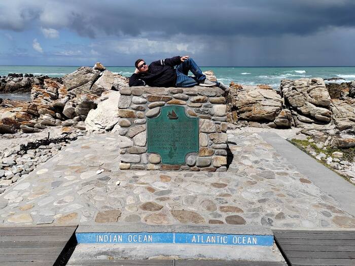 Но самая южная точка, это не МДН, а именно Мыс игольный. Это 270км на восток. Как раз в нём соединяются Индийский океан и Атлантический. ЕДЕМ! Но сперва ночуем в городке Херманус. Это совершенно пустой городок из фильмов про апокалипсис, где люди внезапно исчезли. Дома современные красивые, ухоженные, но людей нет. Как нам объяснили , хозяева приезжают только на праздники или только на новый год. Совершенно безопасный город, без стен и колючей проволоки. Но пустой. Зато первый раз был остановлен гаишнеком. Разумеется негром. С моим то счастьем. И ночью. Он оооочень долго рассматривал мои российские права, так как доставать МВУ мне было лень. Но как узнал что я из России, сразу "аааа Владимир Путн". Тьфу, *ля. Отпустил пожелав хорошего дня. Вежливый такой, улыбчивый, не то, что наши... Затарились вечером в магазине, с трудом нашли арендованное жильё и спать. Колючки не было, был просто забор с железный из прутьев. Утром доезжаем и до Игольного. Там огромная каменная карта Африки с рельефом и табличка, разделяющая два океана. Долго там не пробудишь, пустовато. Зато погода меняется как кубик-рубика: то дождь, то солнце, то ветер. Галку поставили.