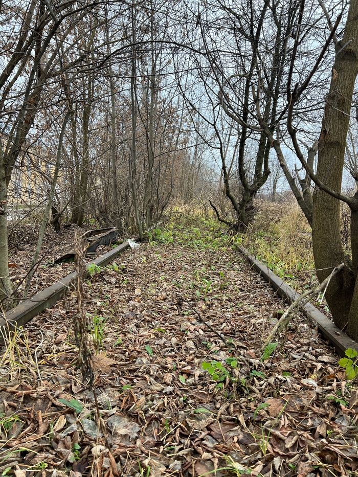 На следующее утро повел Таню к усадьбе другим маршрутом, заодно поглядев на элемент палеоландшафта – заброшенную ж/д ветку. По сути, сейчас дорога упирается в охраняемую стоянку, и все. Для меня подобные объекты представляются крайне любопытными – ведь зачастую они ведут (вели) на какое-то производство, или стратегически важный объект (опять же, военная часть или крупный склад, нефтебаза). Но здесь уже не было ничего, а судя по деревьям, которые вымахали до 10 метров в высоту, поезда по этому участку не ходили уже много-много лет.