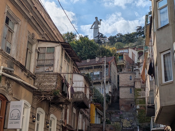 Оттуда открывается шикарный вид на город, а иногда там проводят винные фестивали. Сам Тбилиси переполнен различными рестиками, бесконечными кофейнями и уличными торговцами барахла. Пройдись по мосту Мира, красивое сооружение"