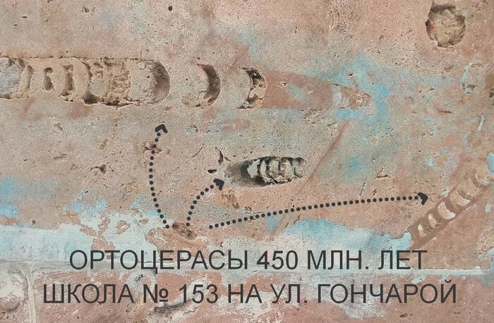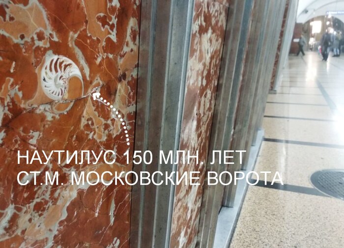 Например, на вокзале в Пушкине можно найти аммонит около решетки отопления и морские лилии в проходе, а также на бюсте Пушкина останки брахиоподов.