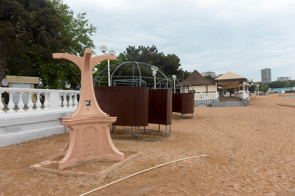 С точки зрения оборудования пляж вполне хорош. Здесь есть навесы и зонтики, бесплатные лежаки, кабинки для переодевания, туалеты и душ. Всё к сезону привели в порядок: подкрасили, подновили, так что выглядит всё опрятно.