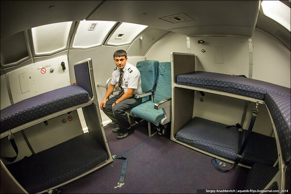 У командира экипажа и второго пилота тоже есть свое отдельное место для отдыха. Как правило, оно находится прямо над кабиной пилотов. В отличие от компактных мест бортпроводников, здесь часто установлены кресла, сравнимые по комфорту с бизнес-классом, отдельные спальные места для каждого пилота и даже свой туалет.