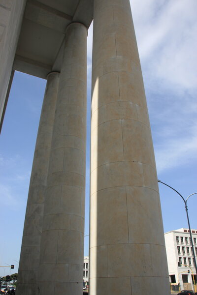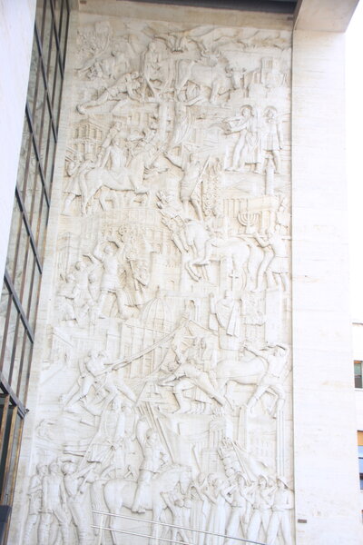 Композиционным центром района является площадь с обелиском, посвященным Гульельмо Маркони. Это тринадцатый и пока последний по времени установки обелиск Рима. Для его создания потребовалось двенадцать плит каррарского мрамора. Изображения на нем, разумеется, прославляют новую Италию. Точно так же барельефы и скульптуры по всему району воспевают «новую, лучшую жизнь» и «нового человека». Все это удивительным образом перекликается с архитектурой и монументальным искусством нацистской Германии (у меня невольно всплывали в памяти образы Мюнхена) и сталинского СССР. Невероятно интересно наблюдать эти общие корни и сходную идеологическую подоплеку, выраженную в камне.