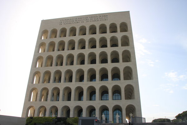 Осмотрев несколько зданий, я направилась к главной цели — Дворцу труда, тому самому «Квадратному Колизею». Он действительно бесподобен. Пожалуй, даже античный Колизей не производит столь сильного впечатления своей формой. На фронтоне здания высечена надпись: «Народ поэтов, художников, героев, святых, мыслителей, учёных, мореплавателей и путешественников». Это, конечно, о итальянцах.