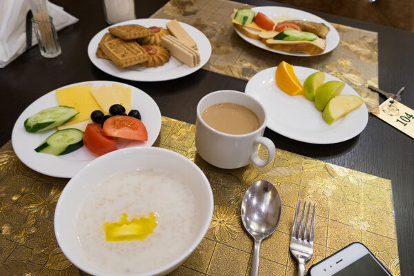 Отдельная тема — завтраки по системе «шведский стол». Все всегда свежее и очень вкусное. Меню немного варьируется, но обязательно есть два вида каш, два варианта горячего блюда (например, гречка с овощами и омлет или блинчики), нарезка из сыров, колбас и овощей, отварные яйца, несколько видов хлопьев, фрукты (апельсины и яблоки), печенье и вафли к чаю. Напитки на выбор: чай нескольких сортов, кофе, молоко. Завтрак получается настолько плотным и качественным, что заряжает энергией на весь день. И что радует — уровень сохраняется из года в год.