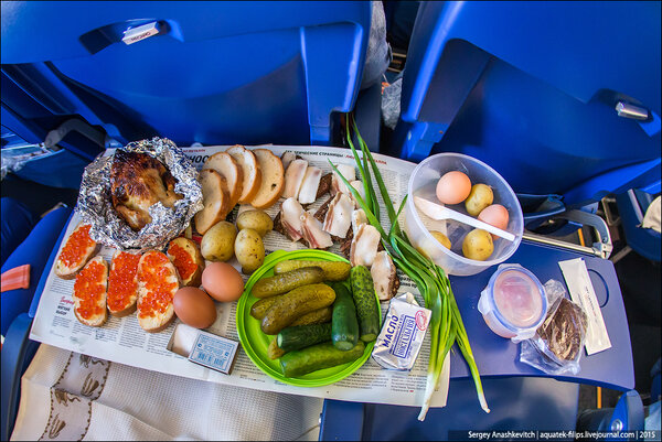 Пока они разливали томатный и апельсиновый сок, мы с подругой, опустив столики, стали раскладывать наше угощение. На третьем месте у окна сидела незнакомая женщина, которая сначала округлила глаза от удивления, а потом рассмеялась и на предложение присоединиться ответила: «Конечно, да! Такого я ещё не видела!».