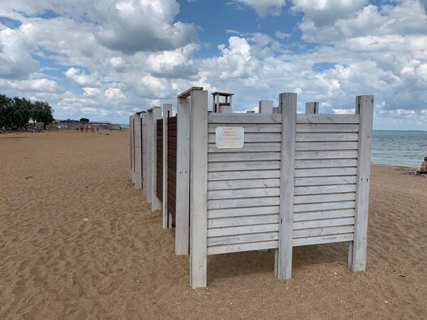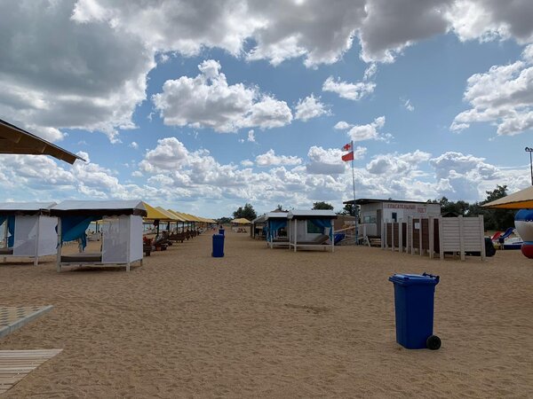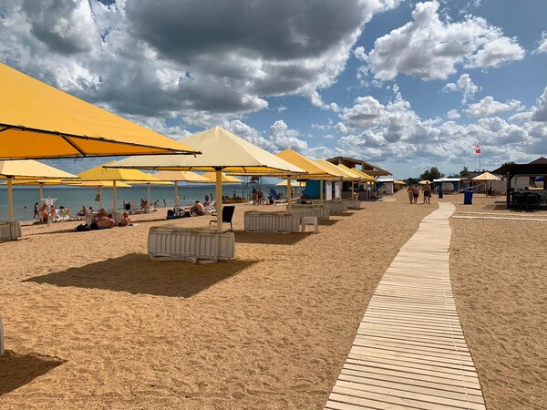 Протяжённость центральной пляжной зоны составляет почти два километра, но благоустроена пока только её часть. И нужно отметить, что сделано это довольно качественно: в наличии лежаки с зонтиками, удобные топчаны, урны, деревянные настилы, раздевалки, туалеты и даже специально оборудованные места для людей с ограниченными возможностями. Лучше один раз увидеть: