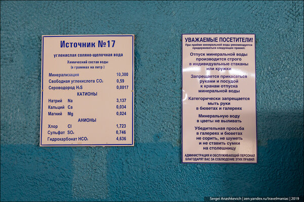 Если бы не современные смесители, сменившие старые советские краны с барашками, у меня было бы полное ощущение, что я попал в машину времени и перенесся в 1985-й год. Именно тогда я с родителями отдыхал в санатории с похожей питьевой галереей, куда люди приходили со своими стаканами и специальными фляжками для лечебной воды.