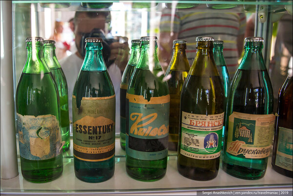 Именно так, как они стояли в моем (и, уверен, в вашем) далеком детстве на полках и в металлических сетчатых ящиках обычных продуктовых магазинов, они и выставлены сегодня на витрине в бювете города Пятигорска.