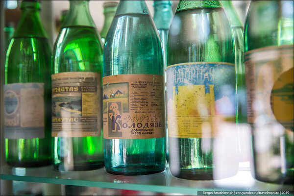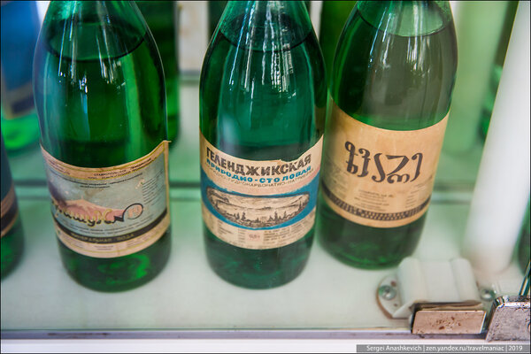 А рядом — та самая витрина-музей, где собрана целая коллекция бутылок с самыми популярными в СССР минеральными водами: