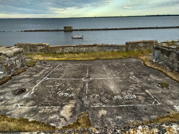 Снаружи же форт предстаёт искусственным островом, почти полностью покрытым бетоном. Из этого бетонного массива то тут, то там выступают доты, наблюдательные посты, орудийные дворики и прочие элементы военной архитектуры. С тыльной стороны острова расположена гавань для кораблей, где мы и бросили якорь. Со стороны открытого моря форт защищён от волн и льда высокой и массивной бетонной стеной.