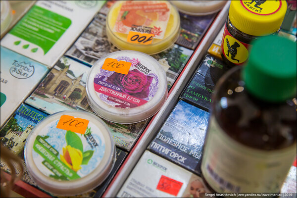 Внутри царила знакомая атмосфера: краники с водой, бумажные стаканчики, лечебная «Ессентуки №17», пенсионеры и мамы с детьми. Рядом с источником располагался небольшой киоск с сувенирами: кружки, магниты с видами Кавказа и какие-то коробочки с баночками.