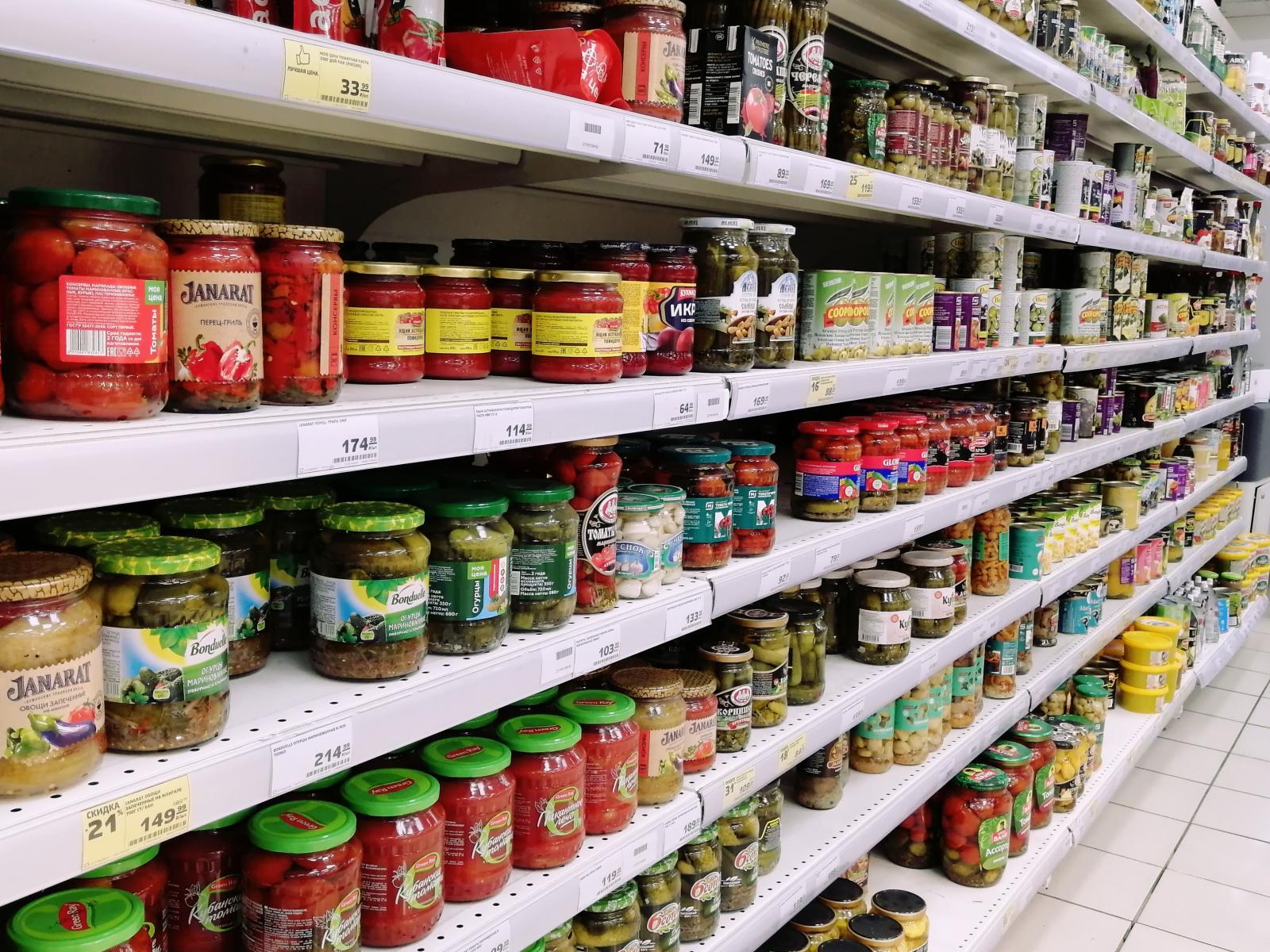 Этот снимок наглядно показывает, как целый 10-метровый ряд в супермаркете отдан под фруктовые консервы.