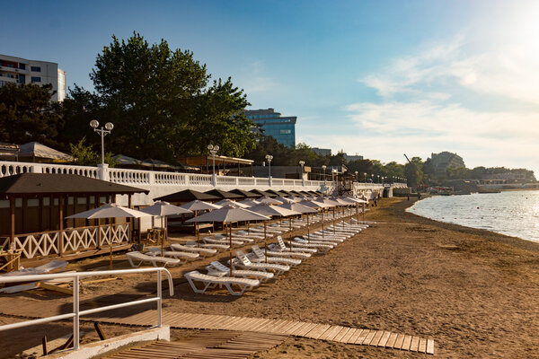 Всё обустроено компактно: вместо массивных навесов стоят лёгкие зонтики, а лежаки расположены всего в два ряда.