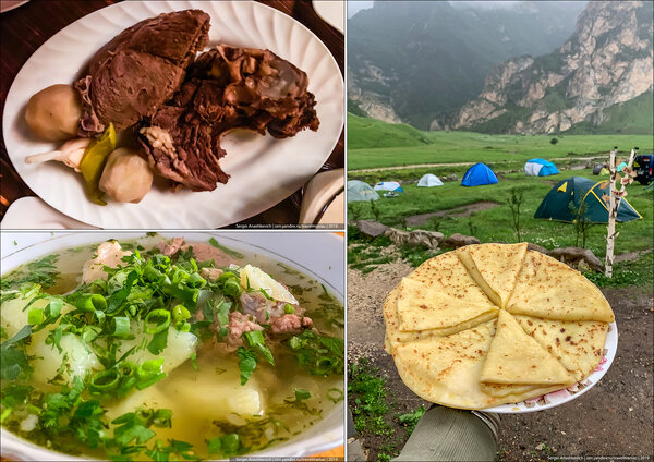 Мясо по-балкарски, шурпа и хычины в Терсколе и Чегемском ущелье. Три этих блюда на троих обойдутся примерно в 1000 рублей.