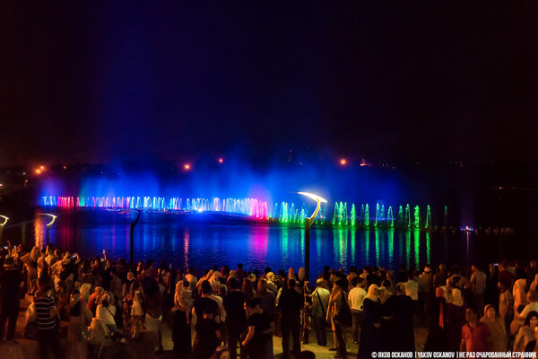 На фотографии этого не так заметно (хотя на двух левых башнях можно разглядеть эти цвета), потому что снимок фиксирует один момент. Но если смотреть вживую или снимать видео, всё это переливается довольно буйным «разноцветием». Конечно, это дело вкуса, но лично мне такой подход не близок.