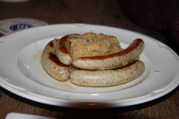 Практически каждый, кто приезжает в Баварию, первым делом слышит совет попробовать вайсвурст — белые колбаски из телятины и свинины с нотками петрушки и лука. Традиционно их едят со сладкой горчицей и, конечно же, запивают пивом. Лично на меня эти сосиски не произвели особого впечатления. Вкус был приятным, но довольно обычным, а поскольку я не пью пиво, возможно, я не смогла в полной мере оценить эту классическую комбинацию.