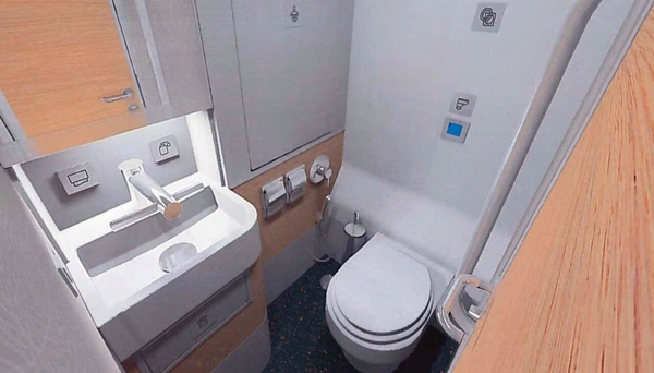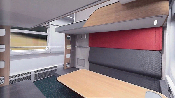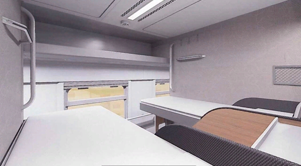 Судя по опубликованным эскизам, из вагона также исчезли третьи, верхние багажные полки. Это решение позволяет пассажиру на верхнем месте сидеть в полный рост, не упираясь головой в потолок, — почти как в классическом купе. Каждое место будет оснащено индивидуальной розеткой для зарядки устройств и персональным светильником для чтения.