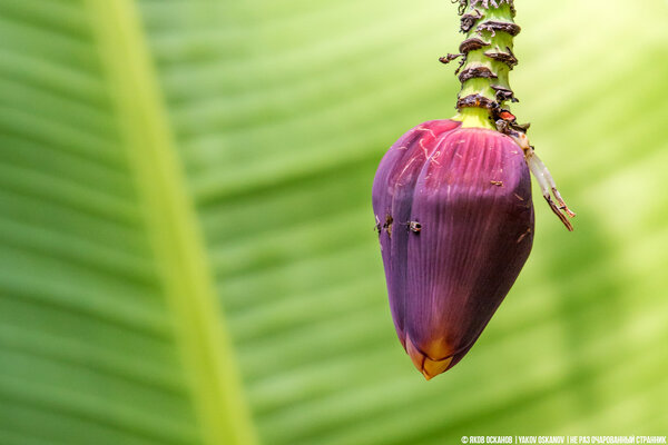 Цветок у банана, в зависимости от сорта, может быть разного цвета. Мне доводилось видеть и лиловые, и ярко-жёлтые соцветия – каждый раз это завораживающее зрелище.