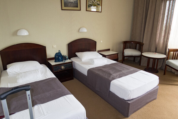 7. Номера. Вот на этом моменте стоит остановиться подробнее. Во всех номерах сделан косметический ремонт, но он очень простой и бюджетный. Многие детали не продуманы, что заметно сказывается на комфорте. Более детально я уже писала об этом здесь. Например, использован самый дешевый ковролин, из-за чего в комнате стоит специфический запах. Мебель, за исключением кроватей, похоже, осталась еще с советских времен. Кровати же и матрасы новые и вполне комфортные. Постельное белье и полотенца тоже нормального качества.