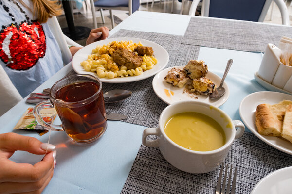 3. Питание. Еда здесь действительно на хорошем уровне. Полный пансион уже включен в стоимость проживания. Подача организована по принципу шведского стола. Все блюда свежие, вкусные, и их постоянно пополняют. Особых кулинарных изысков нет, меню напоминает хороший санаторий советских времен, но нам оно понравилось. Всегда в наличии фрукты, овощи и свежая зелень. Единственный нюанс — перед входом в столовую нужно назвать дежурной номер своей комнаты, чтобы она сделала отметку. Это немного неудобно, но вполне терпимо.