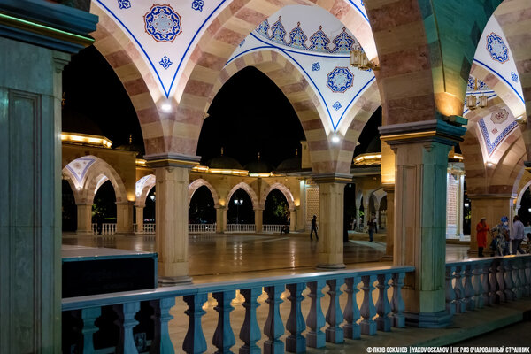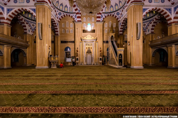 Прогулявшись по территории, мы задумались: а можно ли зайти внутрь? У меня были сомнения, открыта ли мечеть для посетителей так поздно. Позже, уже в Кабардино-Балкарии, мне рассказали, что двери этой мечети открыты для всех, и даже путник, оставшийся без крыши над головой, может найти здесь ночлег.
