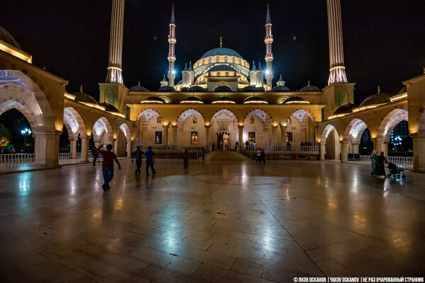 Интересно, что днём эта же мечеть показалась мне менее величественной. Безусловно, она красива и изящна, но ночью, в свете прожекторов, она обретает совершенно иное, почти мистическое звучание. Поэтому, если хотите получить самые сильные впечатления, планируйте визит к «Сердцу Чечни» после захода солнца.
