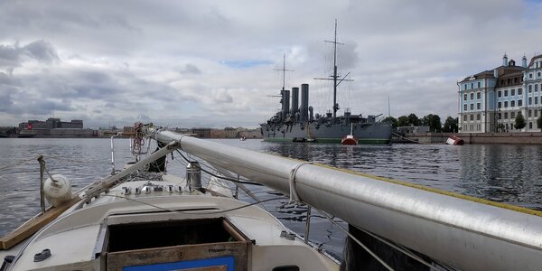 По набережным неслись потоки машин — люди спешили на работу, а мы не торопясь двигались к Большой Неве. Проплыли под Кантемировским, Гренадерским и Ушаковским мостами, миновали легендарную «Аврору», и вот она — широкая гладь Невы.