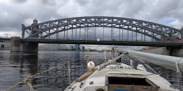 Андрей хорошо знал особенности Невы и посоветовал нам все время придерживаться левого берега. Он также упомянул, что сразу за Вантовым мостом есть яхт-клуб, где мы сможем поднять мачту, ведь дальше по пути уже ничего не будет мешать идти под парусами. Мы попрощались, я завел мотор, Андрей помог оттолкнуться от причала — и наше движение вверх по реке началось.