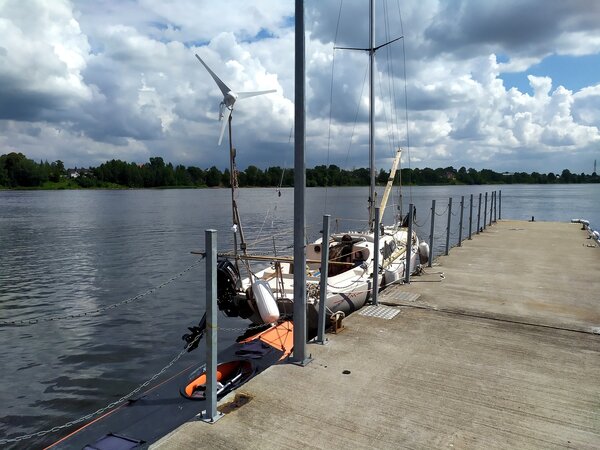 Мы планировали отчалить около шести утра, и как раз в это время к нам заглянул мой старый знакомый Андрей, с которым до этого общались только онлайн. Он направлялся к своей лодке, но решил зайти, чтобы пожелать нам удачи. Вдобавок он преподнес мне отличный подарок — пластиковый шар, напечатанный на 3D-принтере. Эта деталь идеально подошла для самодельной ручки шкотовой лебедки, которую я смастерил взамен утерянной. Как раз не хватало удобной рукоятки, и Андрей прекрасно эту проблему решил.