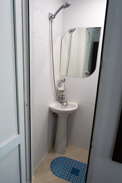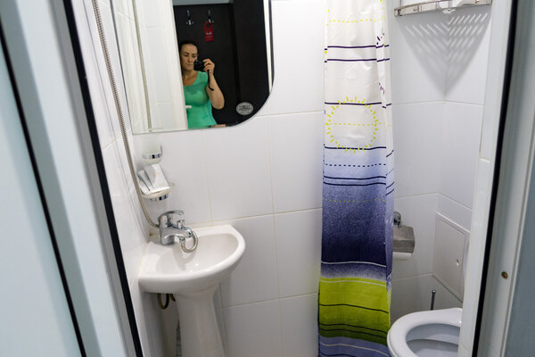 Он крошечный. Душевой кабины как таковой нет: просто шторка, которая должна удерживать воду от унитаза, а влага уходит в отверстие в полу. Лично я не люблю такие решения, но пришлось мириться — всего одна ночь. Главное было не удариться о дверь или стену.