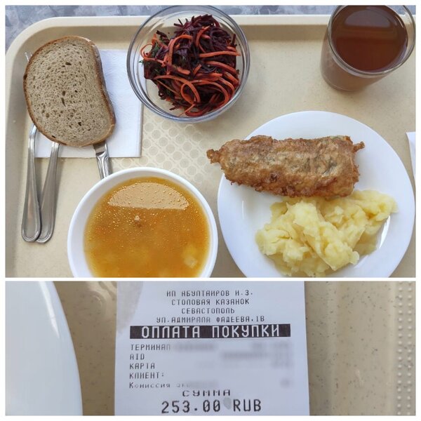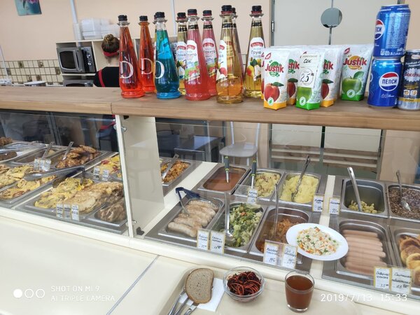 Мой полноценный обед, в который вошли салат, первое и второе с гарниром, в сумме составил 253 рубля. Еда оказалась вполне съедобной, без претензий на кулинарные шедевры, но именно такой, какой и ожидаешь от обычной столовой. Продукты были свежими. Единственное, к чему я всегда отношусь с осторожностью, — это салаты с майонезом, особенно в летнюю жару, поэтому их я бы не рекомендовала.