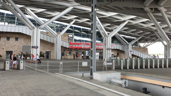 Однако среди всей этой сияющей новизны и благополучия иногда встречаются поистине сюрреалистичные объекты. Один из них — новый железнодорожный вокзал, расположенный прямо на территории Олимпийского парка.