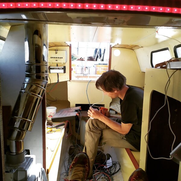 Сколько именно мы потратили на материалы, сказать сложно, но сумма вышла не слишком большой, ведь почти все работы мы делали своими руками. Пришлось покупать краску, поликарбонат, полиэтилен, металл для печи и подмачтового бимса, материалы для электрики и фанеру — всё это относительно недорого. Главное — желание, время и готовность учиться новому.