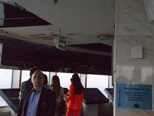 В холле башни нас встретила толпа людей, которые суетливо перемещались. Оказалось, что к лифту пускают группами: одни поднимаются, другие спускаются.