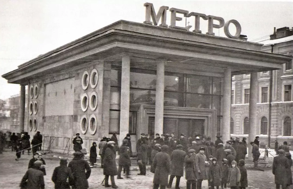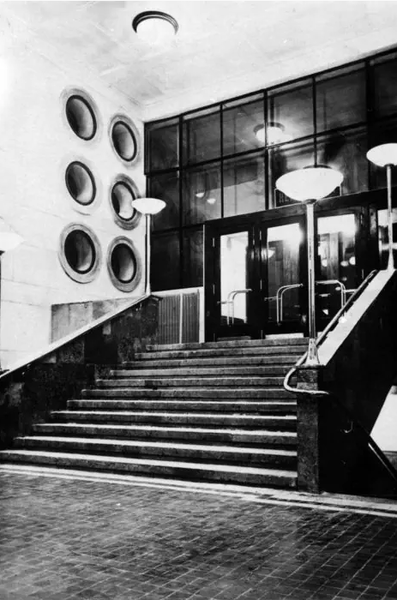 Внешний вид входа в те годы, как видно на архивных снимках, был удивительно лаконичным и монументальным. Если сравнить его с современными фотографиями, становится понятно, что основная архитектурная идея — строгий «кубический» объем — сохранилась спустя десятилетия.