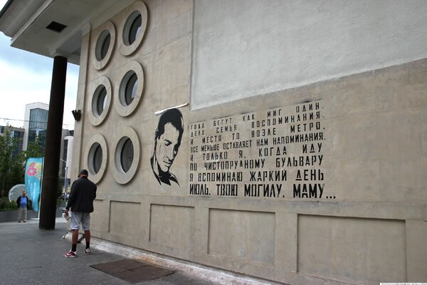 Рядом с официальной табличкой во время одной из своих прогулок в июле 2019 года я заметил самодельную надпись, которой раньше не видел. Это оказались стихи. Покопавшись в истории, я выяснил, что они посвящены Юрию Волкову — молодому сотруднику ВГТРК, трагически погибшему здесь в 2010 году. Убийство, в котором подозревались выходцы из Чечни, получило широкий резонанс, особенно в фанатской и ультраправой среде, где Волков был героизирован. Скорее всего, надпись появилась как памятный знак к очередной годовщине этой печальной истории.