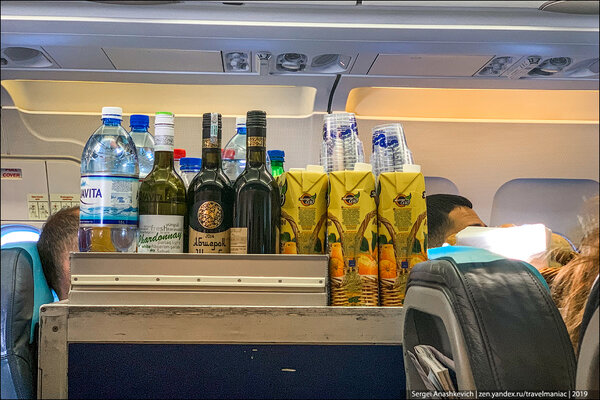 Отличия в подходе к обслуживанию пассажиров стали заметны сразу, как только стюардессы выкатили первую тележку с напитками. Помимо стандартных соков и воды, в ассортименте было красное и белое вино — то, чего в эконом-классе «Аэрофлота» уже давно не встретишь.