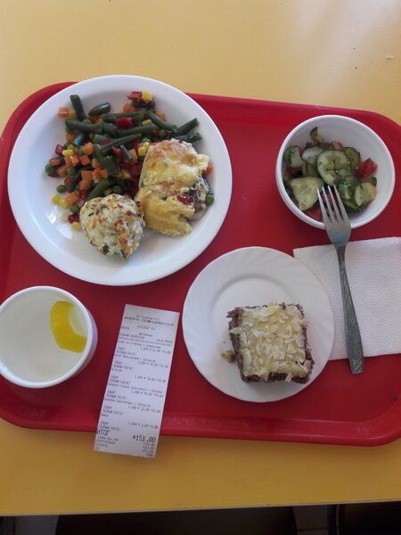 Ещё мне очень понравились кабачки, фаршированные творогом. Их подают как альтернативу мясу, но я использовала их как овощной гарнир. Салаты здесь начинаются от 15 рублей. Например, рыбный салат за 24 рубля был очень вкусным. Полный обед в этот раз составил 130 рублей.